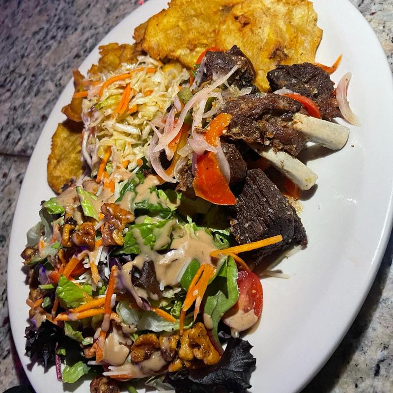 Crispy pork, plantains, rice, pikliz included.